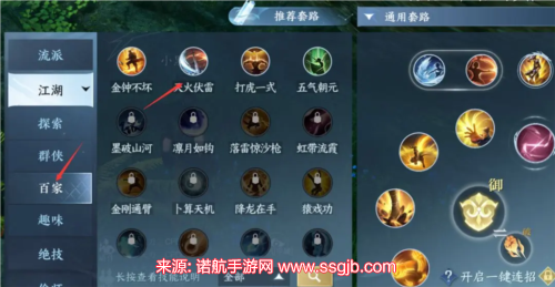 根据上面的建议,点击技能这里的切换图标,或者打开 – 设置 – 武功 – 江湖 – 百家 把技能切换一下也行。