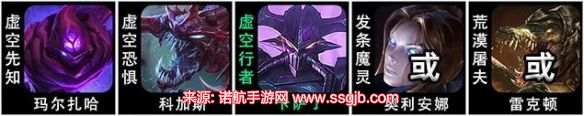 前期强力羁绊:3诺克萨斯、3艾欧尼亚、3虚空、2主宰、2壁垒、2斗士